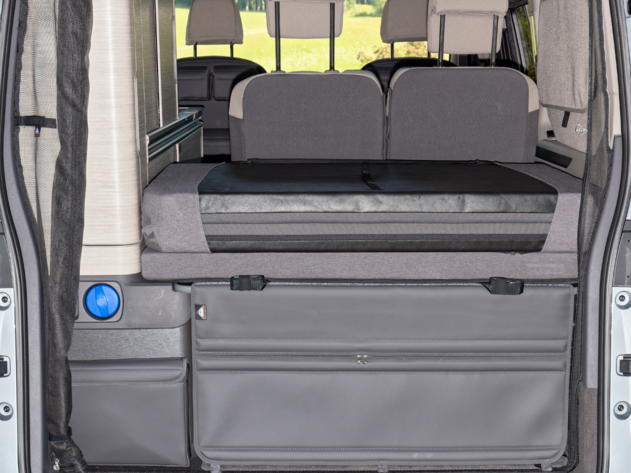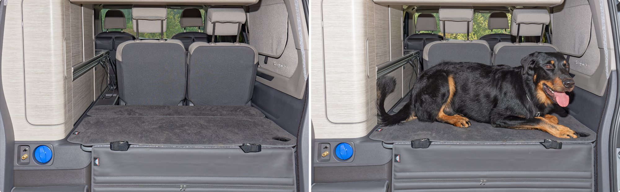 De iXTEND PAD® is vervaardigd uit hetzelfde extreem slijtvaste veloursmateriaal als de originele VW T7 California tapijten. Dankzij de tweedelige constructie met flexibel scharnier blijven alle functies van het originele achterpaneel volledig behouden.
