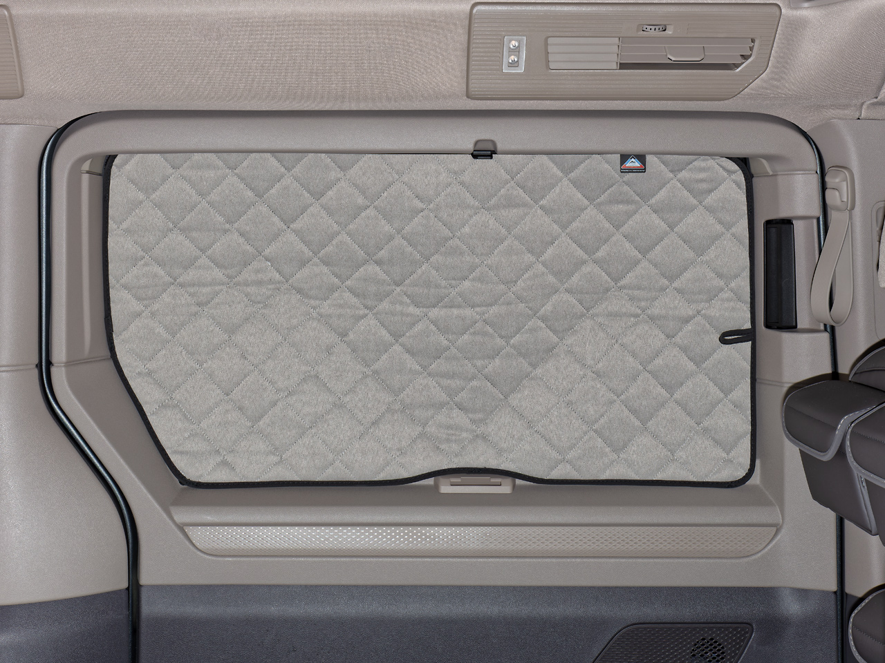 ISOLITE ® Extreme voor schuifraam in de linker schuifdeur van de VW T7 California Ocean/Coast, Beach Camper/Tour is één geheel en wordt bevestigd met klittenband. Het verduisteringsgordijn kan nog steeds worden gebruikt en over de ISOLITE Extreme ® heen worden getrokken en aan de onderkant worden vastgezet.