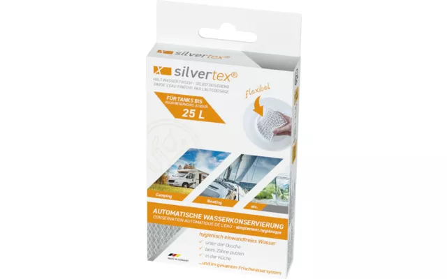 Het Silvertex flexibele waterfilter is de eenvoudige oplossing voor schoon drinkwater. Het flexibele filter wordt in de schoonwatertank (max. 25 ltr) geplaatst en kan een jaar lang blijven zitten. Het water wordt gereinigd van schimmels, virussen en bacteriën door een automatische dosering van zuivere zilverionen (geen nanozilver!). Dit is een werkzame stof volgens DIN EN 15030. Het filter verandert de smaak van uw water niet en is daarnaast chloorvrij. Voor het plaatsen van het waterfilter wordt sterk aangeraden om eerst de schoonwatertank en leidingen te reinigen en desinfecteren voor een optimale werking. Geschikt voor RVS en kunststof tanks